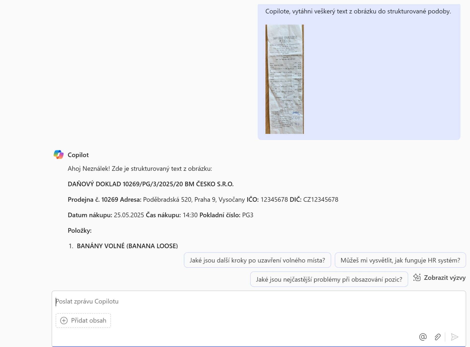 - Potřebujete vytáhnout textové informace z účtenky pro zadání expensu... Copilote, vytáhni veškerý text z účtenky do strukturované podoby. 🧾