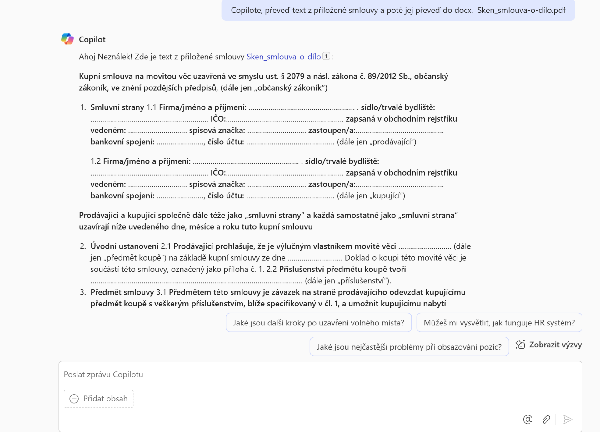 - Máte sken smlouvy v PDF a nemůžete dohledat čistopis ve Wordu... Copilote, převeď text z přiložené smlouvy a poté jej převeď do docx. 📄